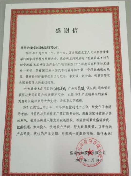 盛瑞傳動“8AT變速箱泵”創(chuàng)新結(jié)構(gòu)設(shè)計,采用油泵與變速器的定位銷與外圓新型安裝方法,減小了壓力脈沖幅值、降低運行噪音、降低了裝配成本。技術(shù)處于國際先進水平,為其配套生產(chǎn)的8AT自動變速器研發(fā)及產(chǎn)業(yè)化項目榮獲國家科技進步一等獎。